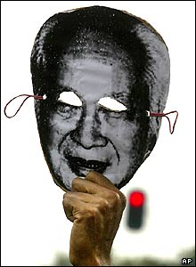 ماسک محمد سوهارتو، رئيس جمهور پيشين اندونزی در دست يکی از تظاهرکنندگان مخالف او در جاکارتا، پايتخت اين کشور. تظاهر کنندگان با انجام راهپيمايی هايی خواستار محاکمه او شدند. سوهارتو که برخی او را يکی از بی رحم ترين و فاسد ترين رهبران تاريخ معاصر می دانند، 8 سال پيش در پی اعتراضات مردمی گسترده از مقام خود خلع شد.