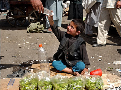 "فولاد"، پسر بچه پنج ساله افغان، در يکی از بازارهای شهر کابل فلفل سبز می فروشد. به رغم کمک های گسترده جهانی برای بازسازی افغانستان، هنوز ميليون ها کودک افغان در فقر زندگی می کنند و تعداد زيادی از آنها مجبورند در خيابان ها دست فروشی کنند.