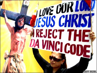 يک فرد کاتوليک، در مانيل، پايتخت فيليپين، پلاکاردی را در اعتراض به فيلم 'رمز داوينچی' حمل می کند. اين در حالی است که شهرداری مانيل نمايش اين فيلم را در اين شهر ممنوع کرده است.