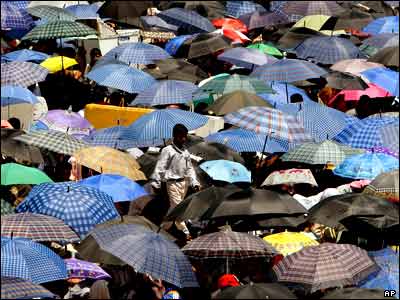 شيعيان در محله صدر بغداد برای در امان ماندن از آفتاب سوزان بعد از ظهر، نماز جمعه خود را در زير سايه چتر برگزار می کنند. |