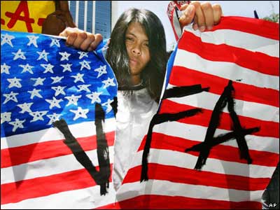 تظاهر کننده ای در جريان يک راهپيمايی ضد آمريکايی در مانيل، پايتخت فيليپين، پرچم آمريکا را پاره می کند. اين راهپيمايی همزمان با محاکمه چهار سرباز آمريکايی به اتهام تجاوز به يک زن فيليپينی برگزار شد. تظاهر کنندگان خواستار اجرای عدالت در مورد اين پرونده و خروج سربازان آمريکايی از اين کشور شدند.