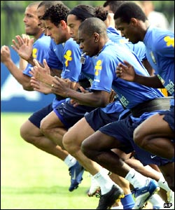 بازيکنان تيم فوتبال برزيل در حال انجام تمرينات ورزشی در سوئيس. اين تيم درگروه f جام جهانی، در مقابل استراليا، کرواسی و ژاپن بازی خواهد کرد.