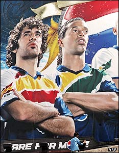 پوستر آگهی مربوط به مسابقات جام جهانی فوتبال با عکس دو فوتباليست معروف: رائول و رينالدو، در شهر اسلام آباد، پايتخت پاکستان. اين مسابقات نهم ماه ژوئن در آلمان آغاز می شود. در اين مسابقات نخستين بازی ايران در مقابل مکزيک خواهد بود.