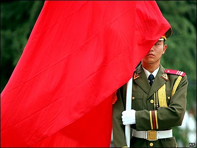 باز هم در چين، سربازی در حال نگه داشتن پرچم کشورش در مراسم خوشامدگويی پرناب موکرجی، وزير دفاع هند در شهر پکن، پايتخت اين کشور.