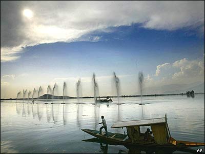 قايقرانان کشميری با جهانگردان هندی در درياچه دال در سرينگار. اسلام گرايان کشميری به يک اتوبوس حامل جهانگردان هندی حمله کرده و 21 نفر را زخمی کردند.
