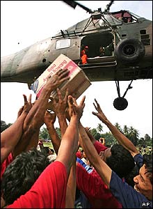 بازماندگان زلزله اخير در اندونزی هنگام دريافت محموله های حاوی مواد غذايی.