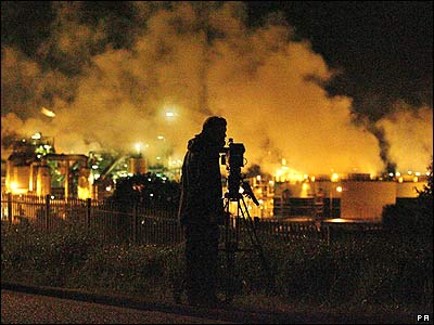 يک فيلم بردار در حال تهيه فيلم از انفجاری که امروز در يک کارخانه توليد مواد شيميايی واقع در بيلينگهام بريتانيا رخ داد. اين کارخانه محلول آمونياك توليد می کرد. |
