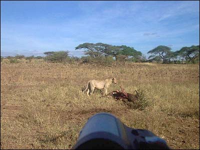 شيری در حال خوردن يک بوفالو که مدتی قبل شکار شده. مسئولان پارک گفتند که ديدن چنين صحنه ای بسيار به ندرت اتفاق می افتد.