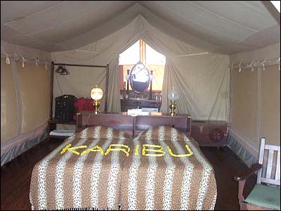 چادر در پارک جنگلی تساوو شرق. روی روتختی به زبان کنيايی نوشته شده کاريبو، يعنی: خوش آمديد