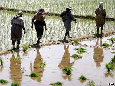 فصل نشا کاری در مزارع برنج در شمال ايران: در عکس گروهی از زنان شاليکار در يک مزرعه برنج ديده می شوند.