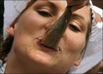 يک زن هلندی در شهر برمن آلمان در آغاز فصل صيد شاه ماهی، يکی از اين ماهی ها را نوش جان می کند...