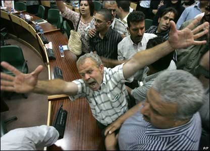 کارمندان خشمگين فلسطينی در اعتراض به عدم دريافت حقوقشان، جلسه شورای قانونگذاری فلسطينی را در شهر رام الله، بر هم زدند.