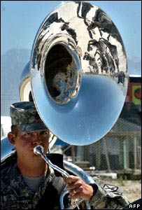 سربازی که در پايگاه بگرام در افغانستان خدمت می کند، در بيست و يکمين سال تولد خود، برای نيروهای آمريکايی شيپور می نوازد. | ||||||||||||||||||||||||||||||||||||||||||||||||||||||||||||||||||||||||||||||||||||||||||||||||||||||||||||||||||||||||||||||||||||||