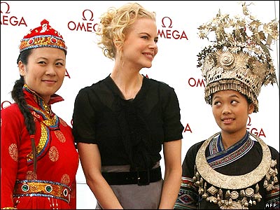 نيکول کيدمن هنرپيشه استراليايی در کنار دو زن از اقليت های قومی چين. وی به عنوان سفير حسن نيت صندوق توسعه سازمان ملل برای زنان، سفر دو روزه ای را به چين آغاز کرده است. |