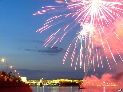 آتشبازی بر فراز رودخانه مسکو، همزمان با نمايش قايق های تفريحی در اين رودخانه.