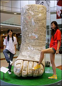 دو دختر در کنار مجسمه پای ديويد بکهام، فوتباليست معروف بريتانيايی در نمايشگاه فوتبال در هنگ کنگ.