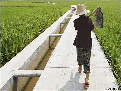 مرد چينی از ميان کشتزار برنج می گذرد. برنج پيوندی يکی از مهم ترين و پرفروشترين محصولات چين به شمار می آيد و سهم بزرگی در تامين خوراک اين کشور دارد.