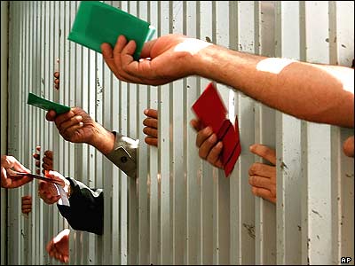 گروهی از کارمندان دولت فلسطينی در شهر غزه کارت های شناسايی يشان را برای گرفتن مبلغ ۳۰۰ دلار آمريکايی تحويل پستخانه می دهند.