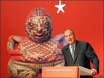 ژاک شيراک، رييس جمهور فرانسه در حال سخنرانی در جريان گشايش موزه جديد "Musee du Quai Branly" در پاريس است که در آن آثار هنری از آفريقا و آسيا به نمايش گذشته می شود. اين نخستين موزه عمده ای است که از سال 1977 در اين کشور گشايش می يابد.