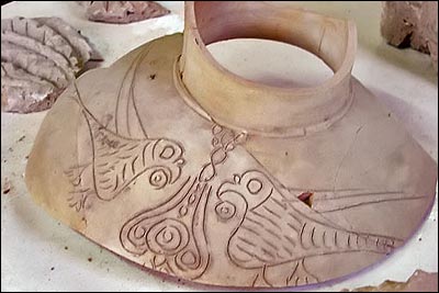 کاسه سفالی کشف شده در آتشکده ری که نقش دو پرنده روی آن است.