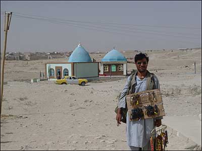 مرد جوان دست فروش در مقابل يکی از زيارتگاههای شهر غزنی، به دوربين من چشم دوخته است.
