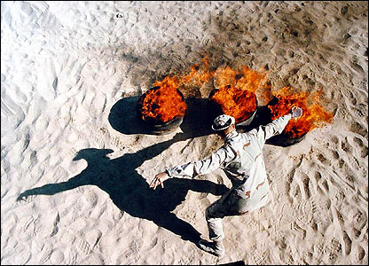 توماس دیلی عکسی از کویت فرستاده و می گوید این مرد ا افزودن گازوئیل به بشکه ها می خواهد محتوای آنها را بسوزاند.
