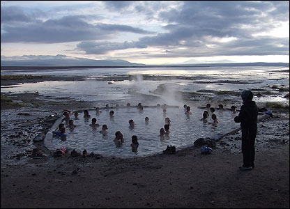 عکسی از استفان بول از کوهستانی در بولیوی در ساعت شش بامداد در حالی که دمای هوا نزدیک به صفر بوده است، مردم از آب گرم لذت می برند