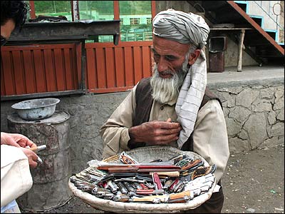 پيرمرد در تلاش است که چاقو و کاردهای خود را بفروشد