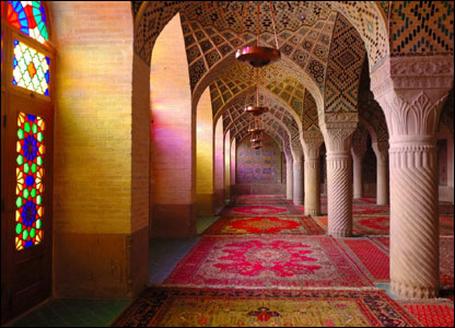"مسجد نصیرالمک به نسبت جدیدتر است. سقف آن کاشیکاری و پنجره هایش شیشه های رنگی دارد."