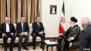 آقای بان نیز در دیدار با آیت اله خامنه ای نیز گفت که او به این دلیل به تهران آمده است که به "قدرت گفت و گو" اعتقاد دارد.