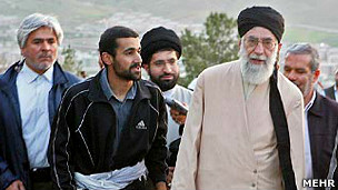 مجتبی خامنهای، نفر وسط، پشت سر رهبر ایران