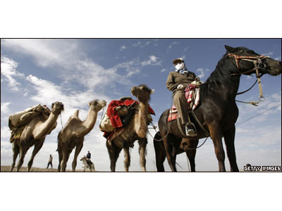 مرد تبتی سوار بر اسب، کاروان شتری را درگولماد، حومه شمال غربی چين، هدايت می کند. قرار است روز ششم ماه ژوئيه، مرز تاريخی تجاری بين چين و هند پس از 44 سال گشوده شود. از طريق اين مرز چينی ها اجازه دارند تا 15 نوع کالا و حيوان، از جمله اسب، بز و گوسفند و همچنين ابريشم خالص، پنبه و پوست مبادله کنند.