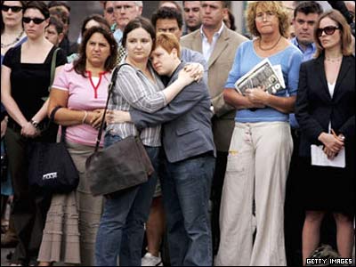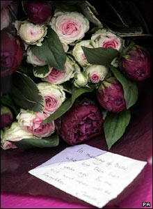عده زيادی از مردم، برخی با چشمان پر از اشک شاهد نثار گل در ايستگاه مترو "کينگز کراس" بودند، جايی که در بمب گذاری انتحاری سال قبل 26 نفر کشته شدند.