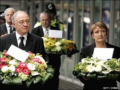 کن ليوينگستون شهردار لندن (چپ) و تسا جاول، وزير فرهنگ بريتانيا در مراسم ويژه يادبود قربانيان در اولين سالگرد بمبگذاری های لندن در ايستگاه مترو "کينگز کراس" شرکت کردند.