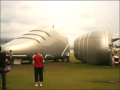 دو کفش فونبال در ابعاد بزرگ که به مناسبت برگزاری جام جهانی به نمایش گذاشته شده اند