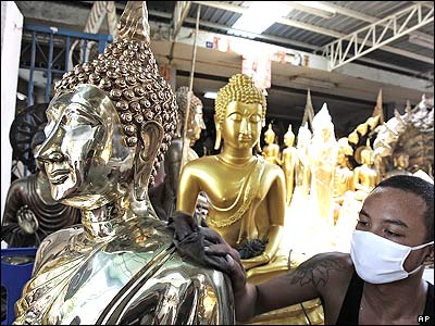 يک کارگر تايلندی درحال جلا دادن مجسمه بودا. روز دوشنبه مصادف است با سالگرد روزی که بودا رسالت خود را به مردم اعلام کرد.