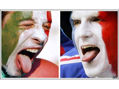 طرفداران تيم های ملی فوتبال فرانسه (سمت راست) و ايتاليا (سمت چپ) منتظر مسابقه نهايی جام جهانی 2006 هستند که فردا در شهر برلين آلمان برگزار می شود |