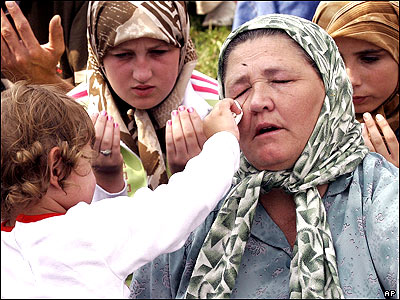 کودکی در سربرنيتسا در حال خشک کردن اشک های مادربزرگش. امروز يازدهمين سالگرد قتل عام هزاران مرد و نوجوان مسلمان ساکن سربرنيتسا به دست نيروهای صرب است که فجيع ترين کشتار غيرنظاميان از زمان خاتمه جنگ دوم جهانی توصيف شده است