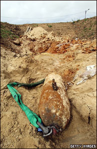 تصويری از يک بمب خنثی شده 250 کيلوگرمی، متعلق به نيروهای بريتانيايی که از جنگ جهانی دوم برجای مانده است. اين بمب در غرب فرانسه پيدا شد. در جريان خنثی سازی اين بمب 5200 ساکن اين منطقه مجبور به ترک موقت محل زندگی خود شدند.
