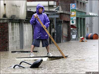 يکی از ساکنان سئول پايتخت کره جنوبی، سوار بر يک تخته شناور سعی دارد با عبور از خيابانهای سيل زده اين شهر خود را به مکانی امن برساند. بارش بارانهای موسمی امروز مناطقی از کره جنوبی را زير آب فرو برد. گزارش شده که حداقل 12 نفر کشته و 25 نفر مفقود الاثر شده اند.