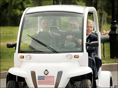 جورج بوش رييس جمهور آمريکا در حال راندن يک خودرو الکتريکی مخصوص بازی گلف در کاخ کنستانتينوفسکی در شهر سن پطرزبورگ روسيه. نخستين نشست سران هشت کشور بزرگ صنعتی جهان بامداد امروز در سن پطرزبورگ آغاز شد.