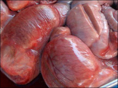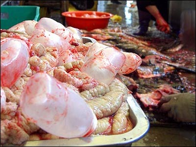 کيسه های هوا و اشپل ماهی کپور در بازاری در خارج از پکن که بلافصله پس از پاک کردن ماهی از داخل شکم آنها بيرون کشيده می شود. چينی ها به ماهی کپور خيلی علاقه دارند و معمولا در فروشگاه ها به صورت زنده فروخته می شود.