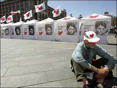 يکی از طرفداران يوليا تيموشنکو، نخست وزير پيشين اوکراين در مقابل مرکز تبليغاتی که توسط حاميان او در ميدان "استقلال" کيف بر پا شده است.