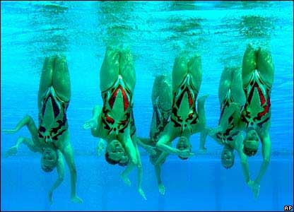 اعضای تيم شنای هلند در حال انجام حرکات گروهی موزون در آب، درجريان مسابقات قهرمانی اروپا در بوداپست، پايتخت مجارستان.