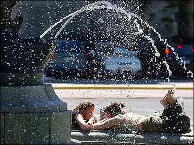 در حاليکه دمای هوای ورشو، پايتخت لهستان به بيش از 30 درجه سانتيگراد رسيده، دو زن خود را زير آب يک فواره خنک می کنند.