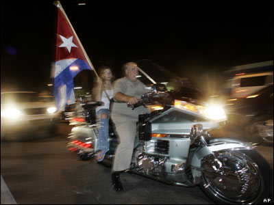 زوج کوبايی سوار بر موتور در فلوريدای آمريکا، پرچم کشورشان را به نشانه خوشحالی از بيماری فيدل کاسترو، تکان می دهند.