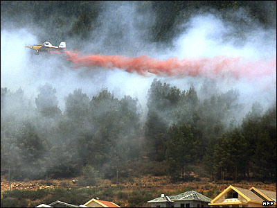 هواپيمای اسرائيلی در حال پاشيدن مواد مخصوص مهار آتش در نزديکی مرز اسرائيل و لبنان.