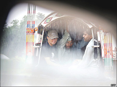 مسافران يک کاميون به بارش سنگين باران های موسمی "مونسون" نگاه می کنند. پانزده نفر از جمله هشت کودکی که از زلزله کشمير جان به سلامت برده بودند در اثر جاری شدن سيلاب به کشمير جان خود را از دست داده اند.