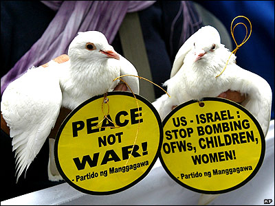 تظاهرکنندگان در مانيل، پايتخت فيليپين در حالی که کبوترهای سفيد با پيام "جنگ نه، صلح" و "بچه ها و زنان را نکشيد" به ادامه جنگ اسرائيل و حزب الله اعتراض کردند