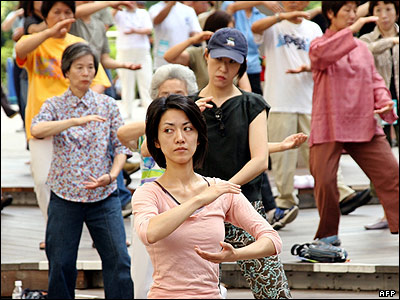 حدود ششصد نفر در تپه های اطراف توکيو در حال اجرای ورزش تای چی. سالانه هزاران نفر از علاقمندان اين ورزش در اينجا جمع می شوند و در يک فستيوال سيزده روزه به ورزش تای چی می پردازند.